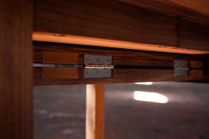 Table en noyer massif. Coulisses en hêtre massif. Finition huilé.