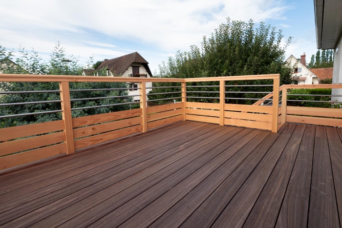 Commande particulière. Terrasse sur pilotis. Assemblage traditionnel en douglas et terrasse en exotique